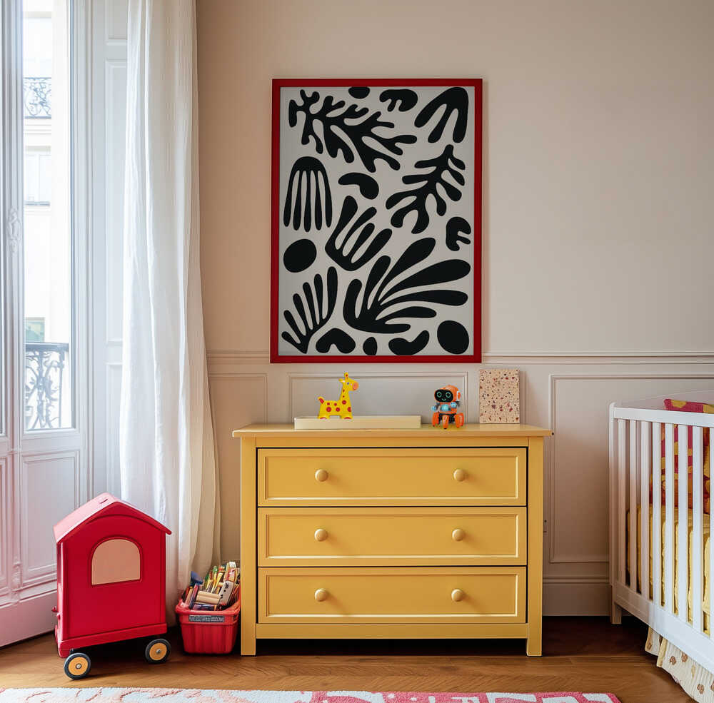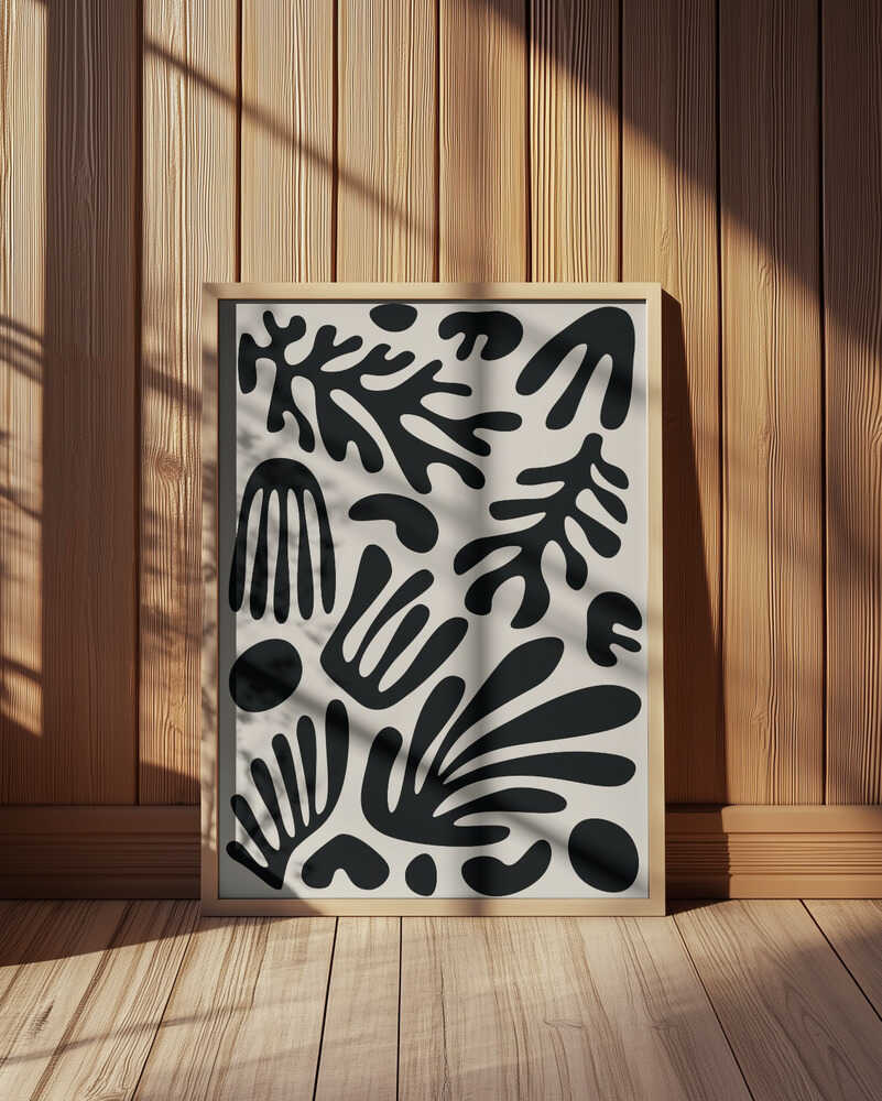 Suteikite savo erdvei išraiškingumo ir ramybės su šiuo įspūdingu plakatu, vaizduojančiu organiškas juodas formas, primenančias povandeninio gyvenimo ritmą. Abstraktūs siluetai teka natūraliai – tarsi koralai ar dumbliai, švelniai siūbuojantys srovėje – kurdami judesio ir tylos stiprybės jausmą. Juodos ir kreminės spalvų derinys suteikia kūriniui modernumo ir amžinumo, puikiai tinka skandinaviškam, minimalistiniam ar meniškam interjerui. Atspausdintas ant aukštos kokybės matinio muziejinio popieriaus, išlaiko ryškų kontrastą ir aiškias detales daugelį metų.