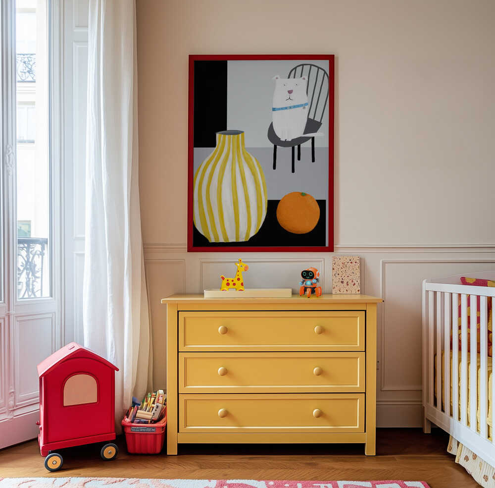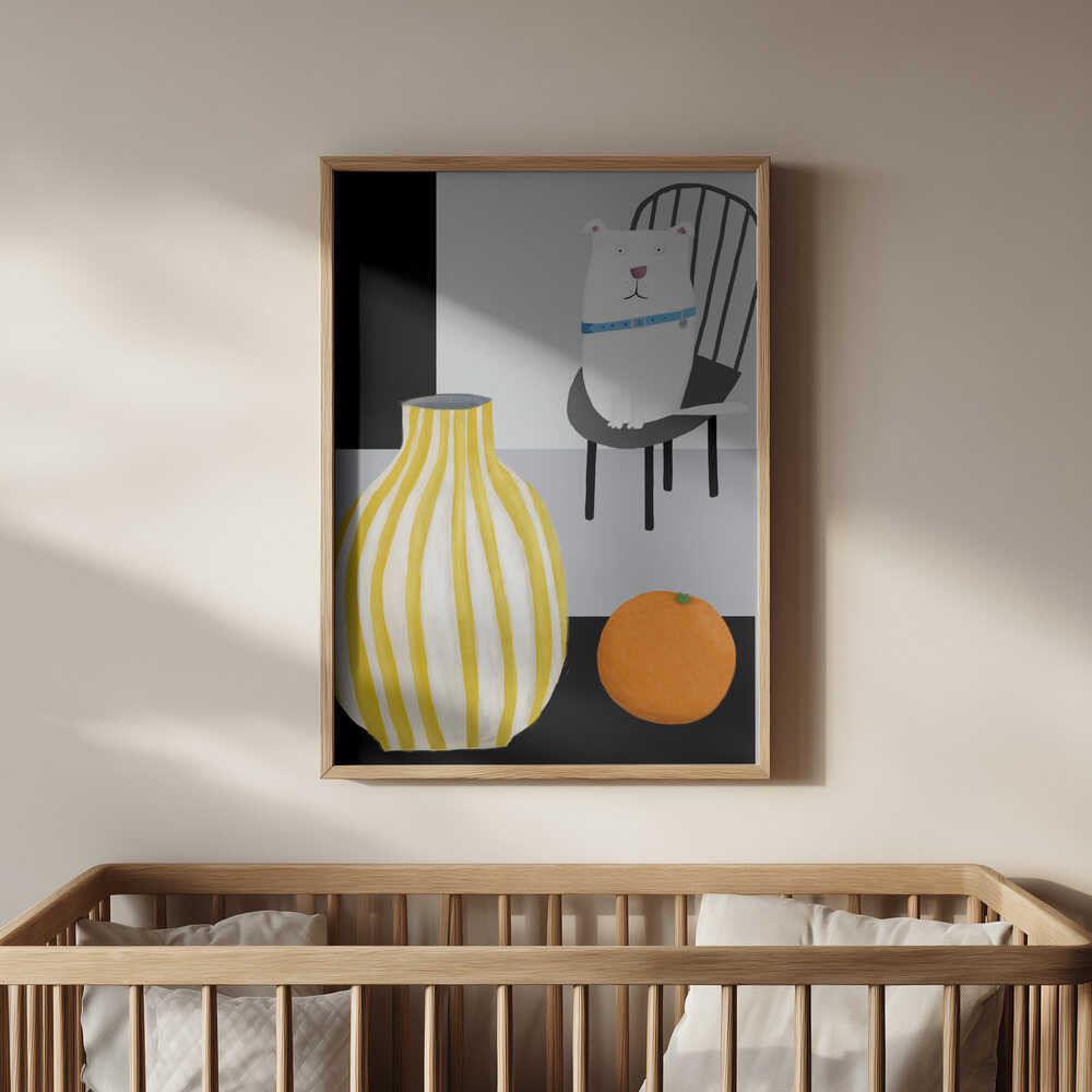 Įneškite į savo namus linksmos ir šiuolaikiškos nuotaikos su šiuo žavingu meno kūriniu, vaizduojančiu baltą šunį ant kėdės šalia geltonai dryžuotos vazos ir ryškiai oranžinio vaisiaus drąsiame geometriniame fone. Minimalistinė kompozicija ir subalansuota spalvų paletė sukuria ramią, harmoningą atmosferą, kuri neerzina erdvės. Sukurta būti kartu laiko nepavaldi ir linksma – puikiai atrodo virš kūdikio lovelės, skaitymo kampelio ar darbo stalo. Žaismingas ir stilingas pasirinkimas vaikų kambariui, kūdikio erdvei ar moderniems šeimos namams. Lengvai derinama su skandinaviško stiliaus interjeru ir galerijos tipo sienomis. Atspausdinta ant aukščiausios kokybės matinio muziejinio popieriaus, kuris išlaiko spalvas ir detales daugelį metų.