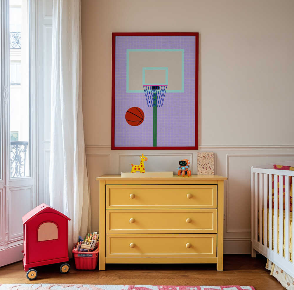 Įneškite į savo namus sportiškos energijos ir spalvų su šiuo žaismingu meno kūriniu, vaizduojančiu ore skriejantį krepšinio kamuolį lavandų tinklelio fone ir minimalistinį lanką. Minimalistinė kompozicija ir subalansuota spalvų paletė sukuria ramią atmosferą, kuri neerzina erdvės. Sukurta būti kartu laiko nepavaldi ir žaisminga – puikiai atrodo virš kūdikio lovelės, skaitymo kampelio ar darbo stalo. Stilingas ir energingas pasirinkimas vaikų kambariui, kūdikio erdvei ar moderniems šeimos namams. Lengvai derinama su skandinaviško stiliaus interjeru ir galerijos tipo sienomis. Atspausdinta ant aukščiausios kokybės matinio muziejinio popieriaus, kuris išlaiko spalvas ir detales daugelį metų.