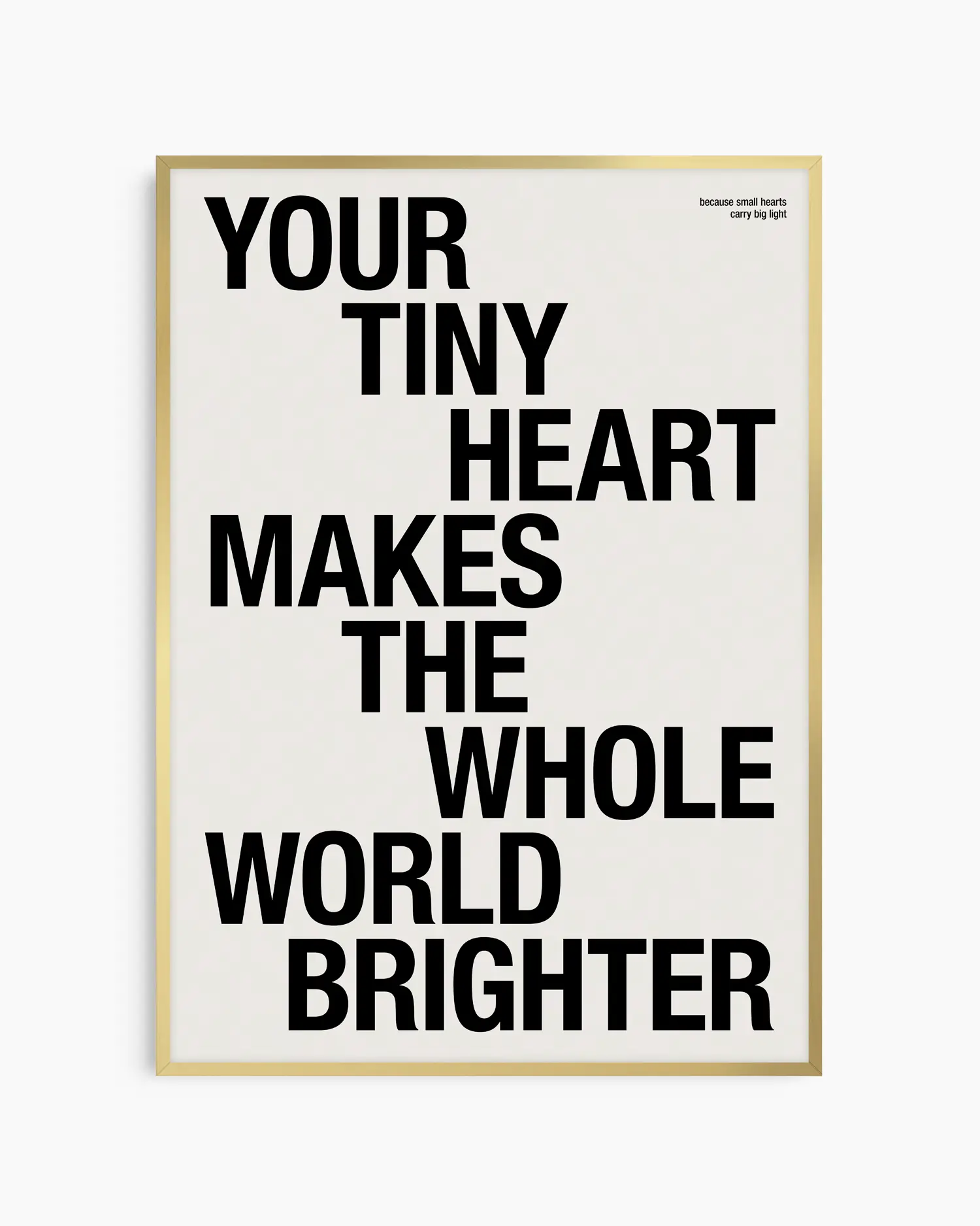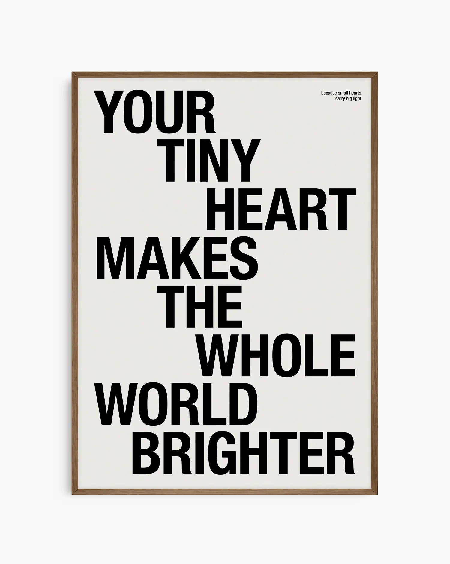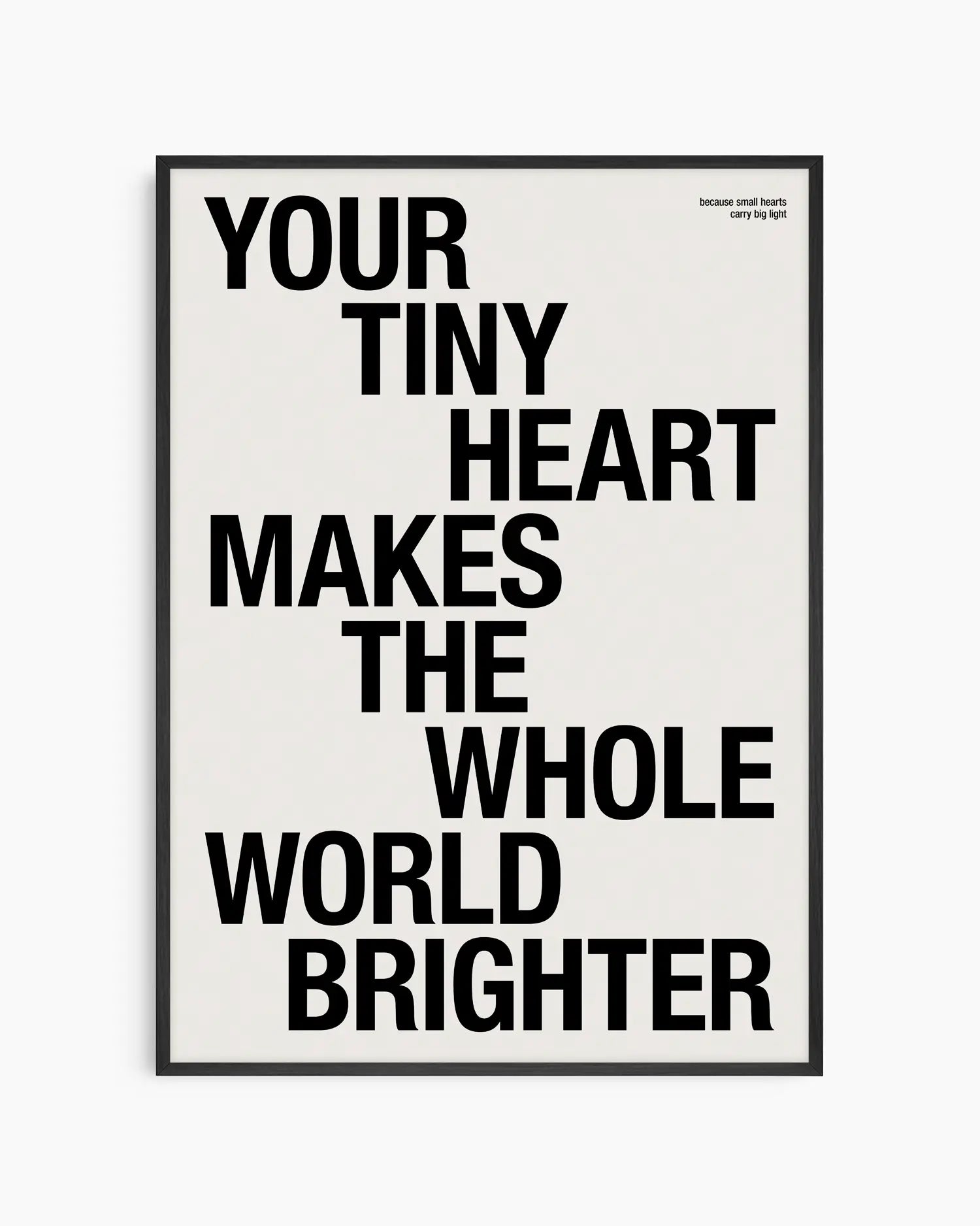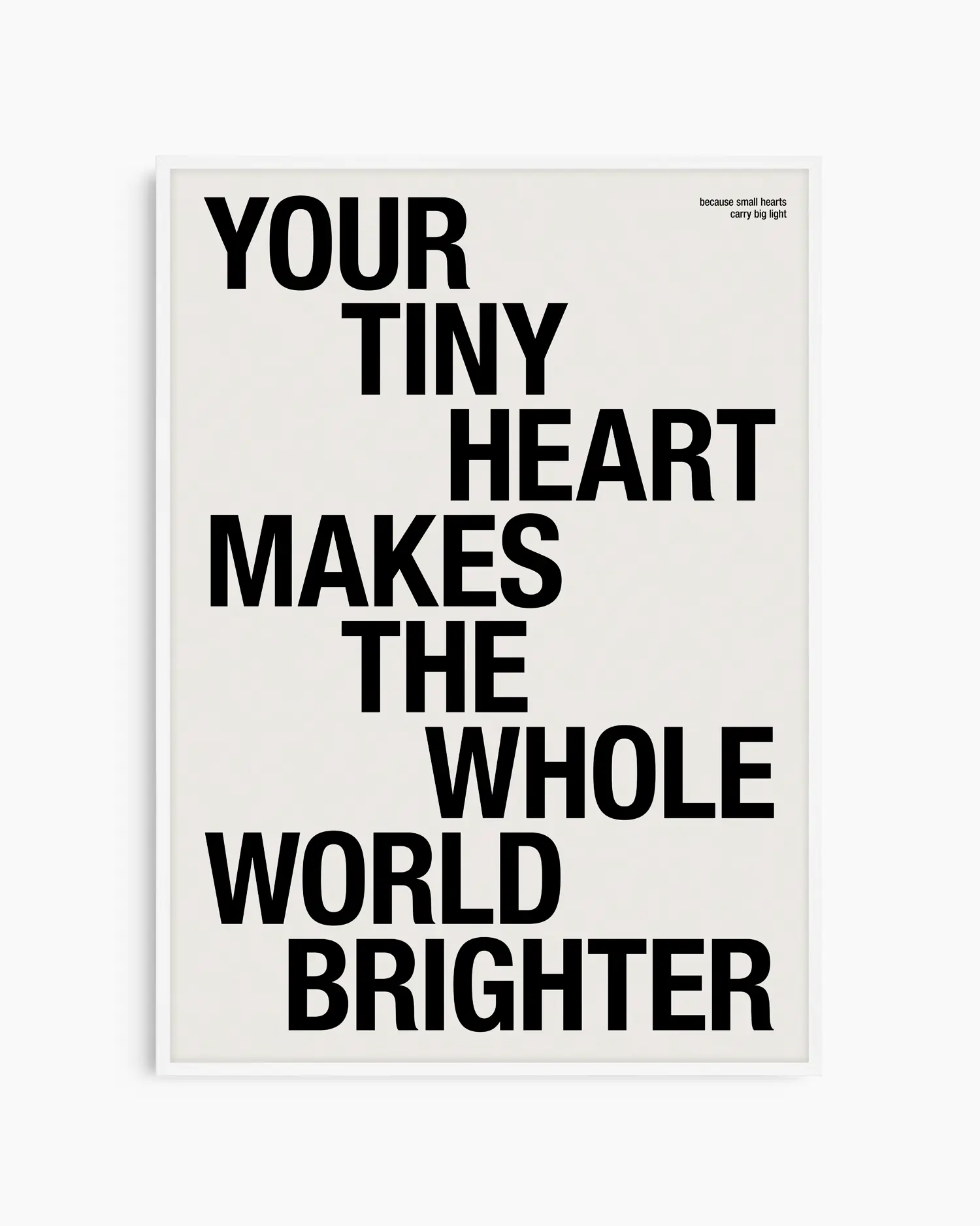 Švęskite ypatingą vaiko buvimo galią su šiuo moderniu ir jaukiu sieniniu plakatu. Su žinute „Your Tiny Heart Makes the Whole World Brighter“ šis kūrinys perteikia gryną magiją, džiaugsmą ir meilę, kurią mažylis įneša į kiekvieną dieną.